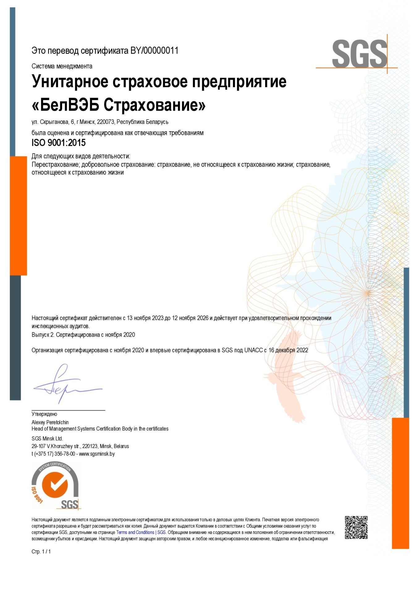 Все это позволило ООО «БелВЭБ Страхование» в 2020 году успешно пройти сертификацию системы менеджмента качества на соответствие ISO 9001:2015. Также соответствие СМК ISO 9001:2015 ежегодно подтверждается успешным прохождением ООО «БелВЭБ Страхование» надзорных аудитов.